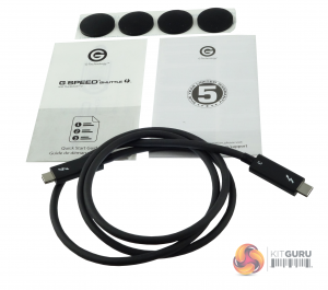 The box containing the various bits and bobs to get you started with the Shuttle come in a nicely branded box, not the usual plain old brown job. Inside there is a Thunderbolt 3 cable, four self-adhesive cushioning pads and warranty and Quick Start pamphlets.