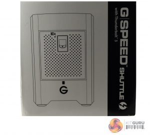 The G-Speed Shuttle comes in a sturdy box with a drawing of the unit on the front. The rear of the box has a display of icons showing some of its features; dual Thunderbolt 3 ports, 1,000MB/s transfer rate, transportable design, hardware RAID and the fact it's backed by a five year warranty.