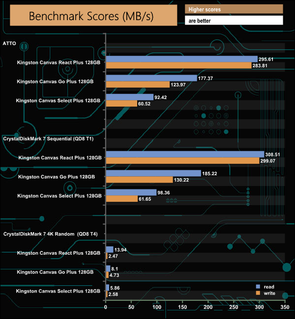 The fastest of the Kingston cards is the Canvas React Plus, with official ratings of up to 300MB/s for reads and 260MB/s for writes. We could confirm those figures with the ATTO benchmark (295MB/s reads, 283MB/s writes) and CrystalDiskMark (308MB/s reads, 299MB/s writes).