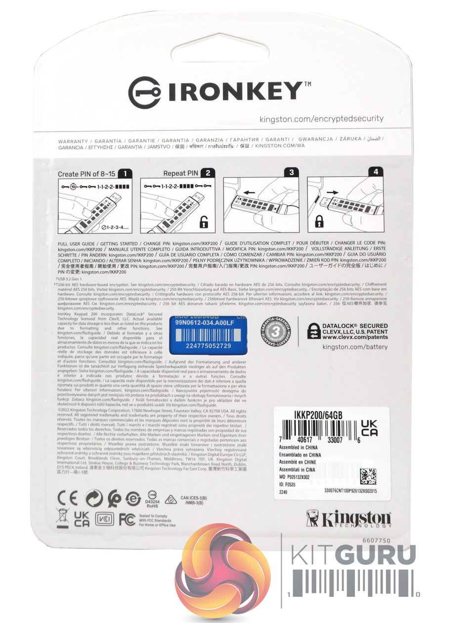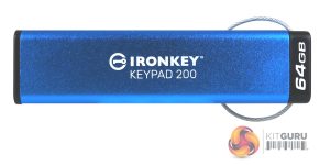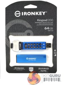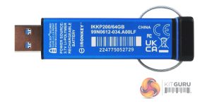 Kingston’s IronKey Keypad 200 drive is packaged in a blister pack with the drive and its outer sleeve sitting in two plastic trays. The cardboard backing is covered in binary code in black while the IronKey logo is picked out in a dark grey with lighter grey text, very neat.