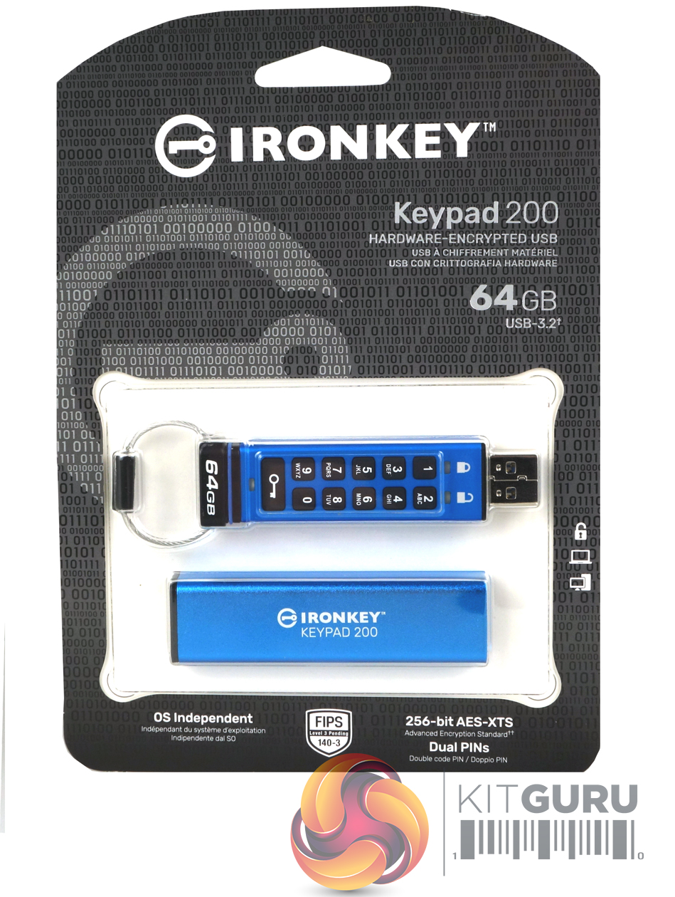 On the top right of the cardboard backing is the drive's capacity along with its interface speed – USB 3.2. Under the blister is a note about it being OS independent, a logo representing FIPS 140-3 Level 3 (Pending Certification) support and then a mention that it has 256-bit AES-XTS encryption and Dual Pin support.
