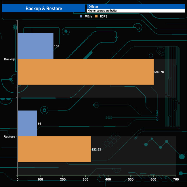 We set IOmeter up (as shown above) to test both backup and restore performance on a 60GB file.