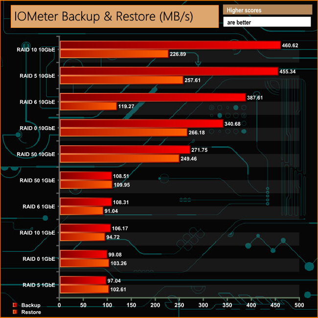 The TS-877 had no problems dealing with our backup/restore tests. With a 1GbE connection the NAS averaged 103MB/s for reads and 100.31MB/s for writes. With a 10GbE connection the transfer speeds are much faster with the exception of the write performance in RAID 6 where the transfer rates drops to 119.27 MB/s.