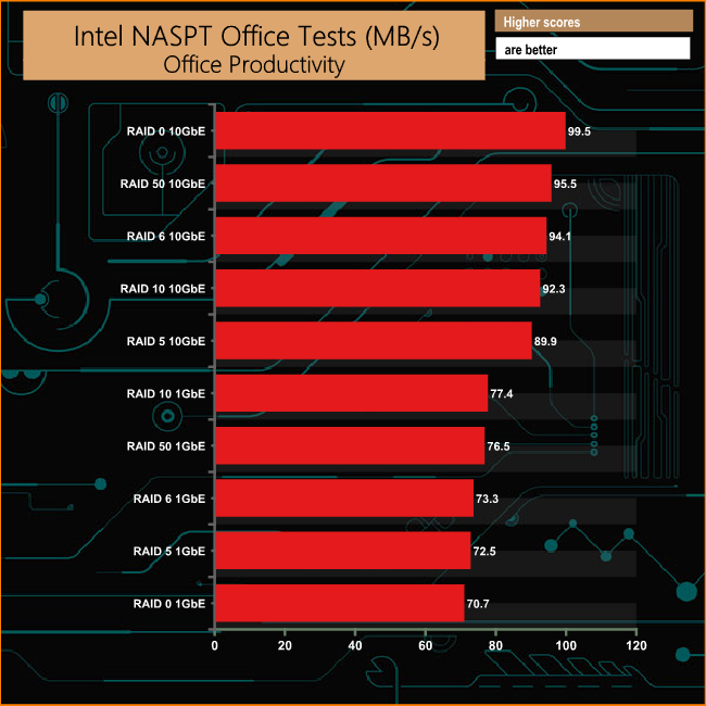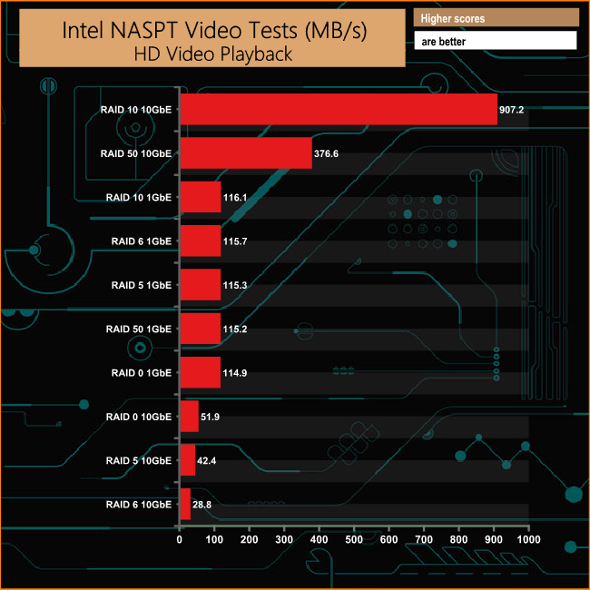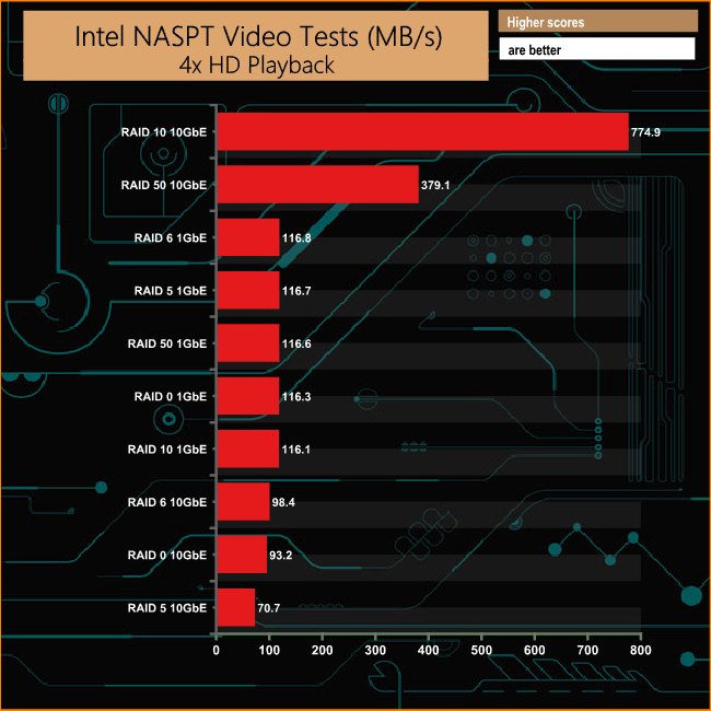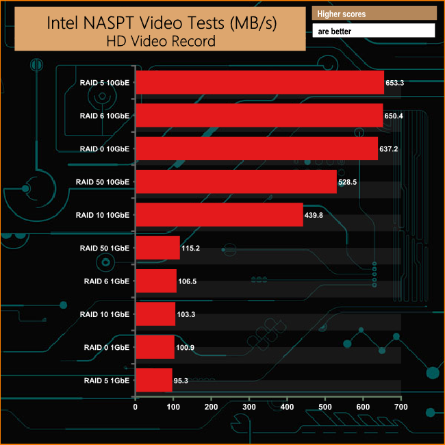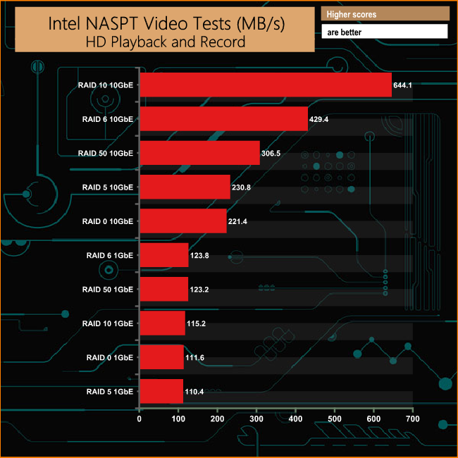 During the 10GbE test runs, something very strange was happening in the HD Video Playback and 4x HD Playback parts of Intel's NASPT test – apart from the RAID 10 and RAID 50 results, the performance dropped off a cliff, something we still are scratching our heads about. However in the HD Video Record and HD Playback and Record tests the 10GbE performance bounced back for all the RAID arrays tested and was consistently much higher than the 1GbE tests as you might expect it them to be.