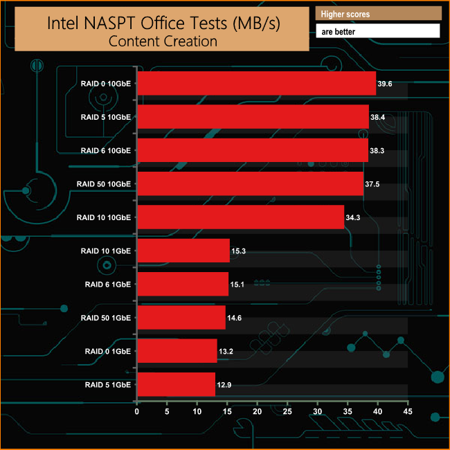 When it came to the office parts of the NASPT benchmark, the Content Creation results over a 10GbE link were over twice as fast as a standard 1GbE connection. The performance gap in the Office Productivity test was much smaller but with all the 10GbE results still out on top. However, when it came to dealing with the multitude of small files in the Photo Album test, the results were much closer and more mixed between the two connection speeds.