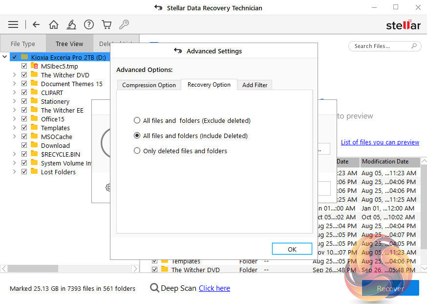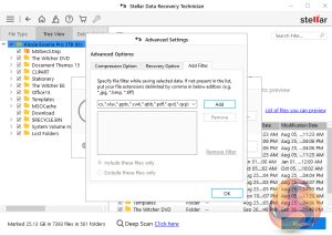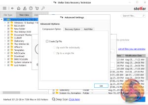 Once you are satisfied that all the files have been found, it's time for the final part of the recovery process, the data recovery itself. First off you have to select which of the files you want to recover (all or individual files), then when you press the Recover button, a location window pops up, and you then specify a location to save the data to. There are some useful tools under the Advanced Settings link at the bottom of the pop-up. Compression Option, Recovery Options and Add Filter.