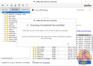 The scan can be stopped at any point. When the scan is completed a dialogue box appears with details of what the scan has found; the number of files, folders and how much data is recoverable. The complete list of data that has been found is clearly displayed. Scanned files are displayed in Tree View, File Type, and Deleted List formats and there is also a preview window that offers a preview of any found file that is supported by the software. This can be turned on or off. To scan our 2TB test drive took 5 seconds, finding 565 folders containing 7,396 files (301.29GB).