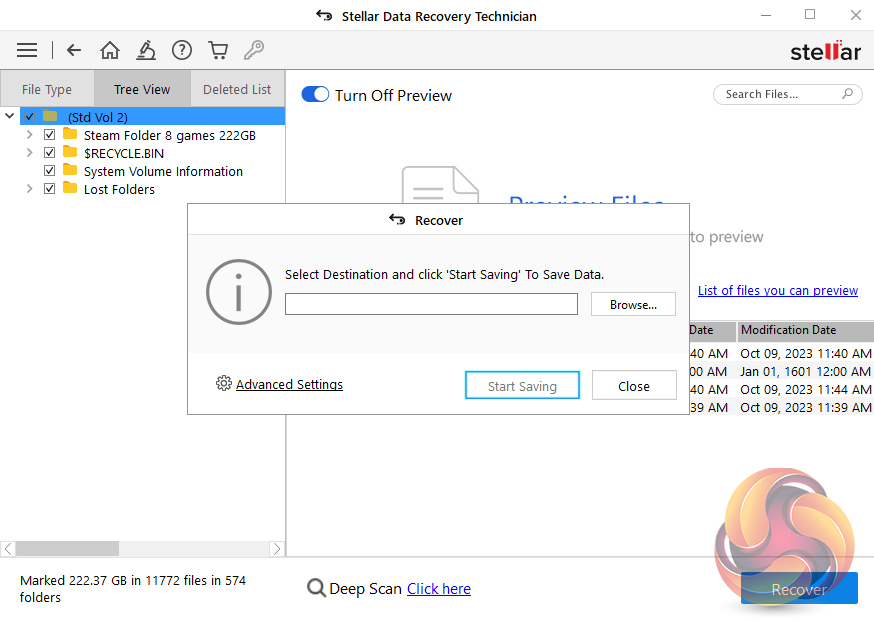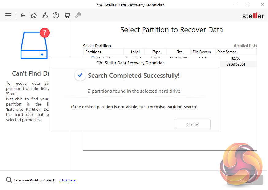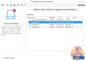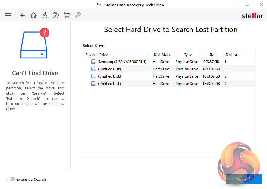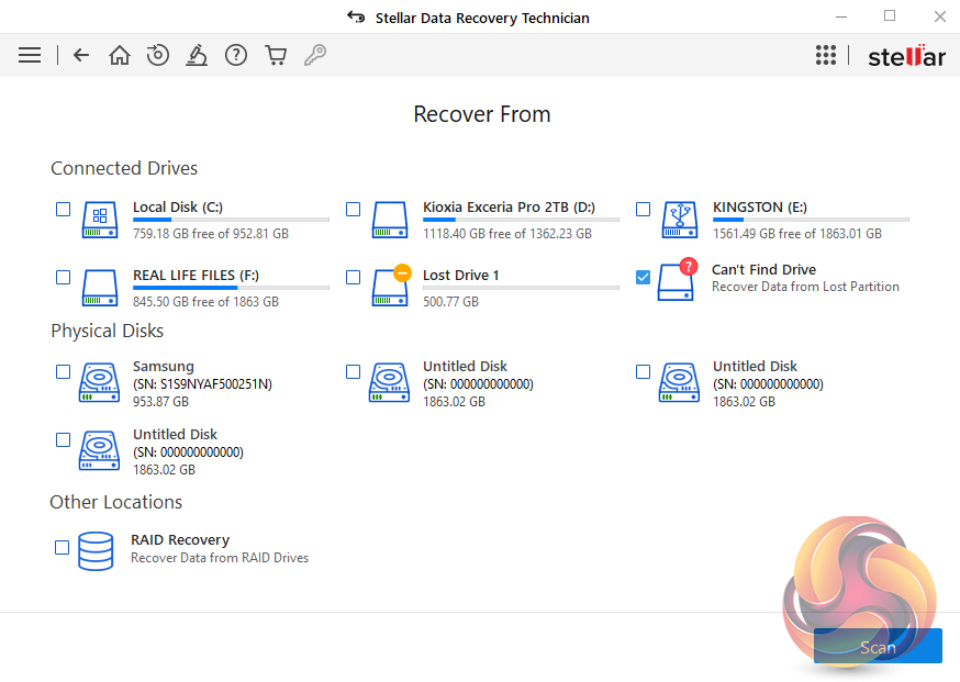 Stellar Data Recovery Technician can be used to also locate and restore lost or deleted partitions. In this example, we've deleted one of the partitions on the drive (in this case the 500GB G partition) and tested the software to see how good it is at finding the lost partition. First off, choose All Data from the What To Recover page and then choose the Can't Find Drive link from either the main Recover From page or the link at the bottom of the page. Then click Scan.