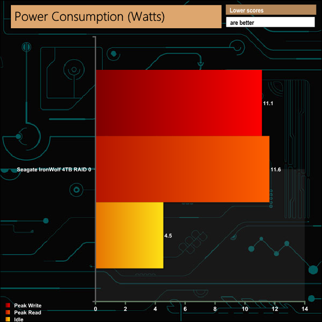 We tested the peak power consumption of the NAS at the wall during a run of CrystalDiskMark 5.0.2 as this version of the benchmark runs the read and write benchmark suites separately, so it's easier to monitor what power the device is using during each function.