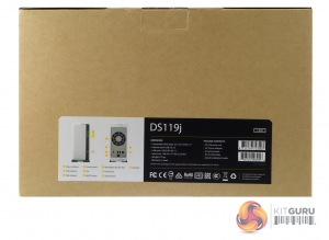 The rear of the box has a label that has two sections. The section on the left-hand side has front and rear images of the DS-119j with pointers picking out its hardware features. The right hand side of the label has a small spec list of the drive along with a list of what's bundled in with it.