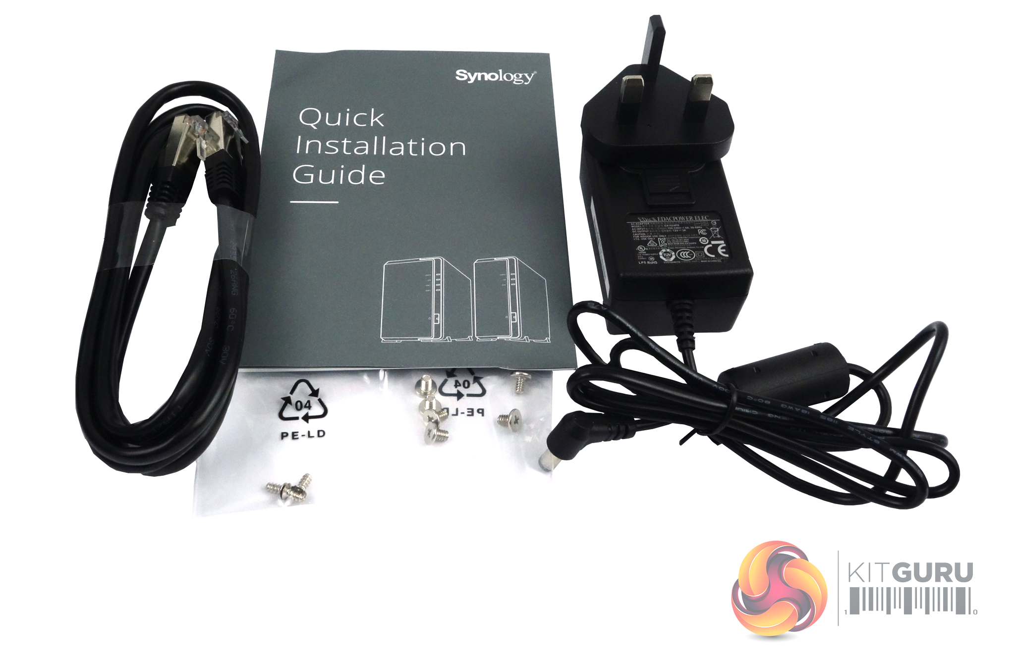 The box bundle for the drive doesn't have much in it, but it's everything you need to get the DS-119j up and running. There's a EDAC EA1024PR 36W power adapter, a decent quality LAN cable, hard drive mounting screws, enclosure screws (out of the box the enclosure doesn't have these fixed in place) and a Quick Installation Guide.