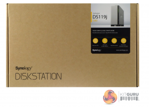The DiskStation DS119j comes in a compact box with a small but clear image of the unit on the front. Under the image there are a couple of lines of text describing some of the features of the unit; Dual-core CPU, quiet and energy efficient, anywhere access and that it uses Synology's DSM software.