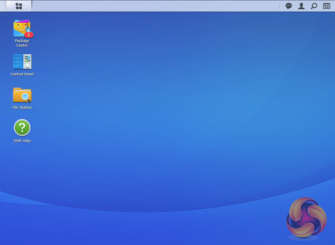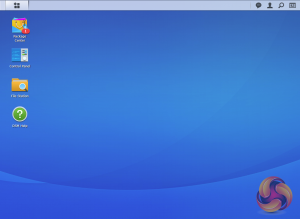 The basic start page just lists four items; Package Center, Control Panel, File Station and DSM help. Clicking on the left-hand tab at the top opens a window with more advanced menu choices than the basic one.