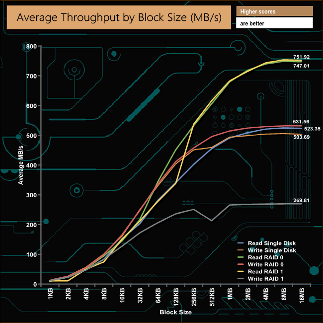 Although we could better the official 390MB/s write figure for the unit in RAID 0 with a score of 531MB/s when it came to the read performance with our tests SSD's in RAID 0 we couldn't quite get to the official 760MB/s figure with a score of 747.01MB/s.