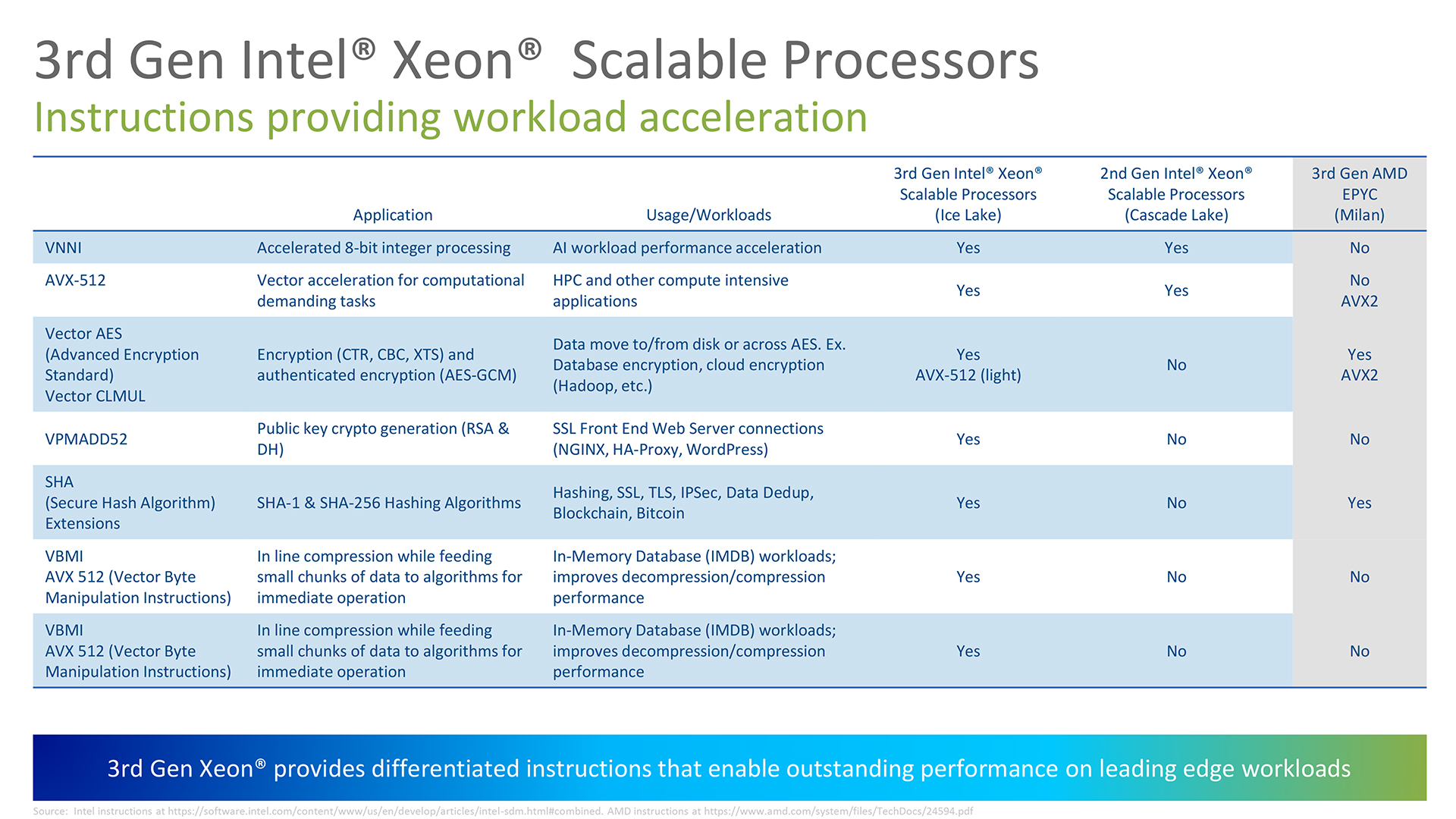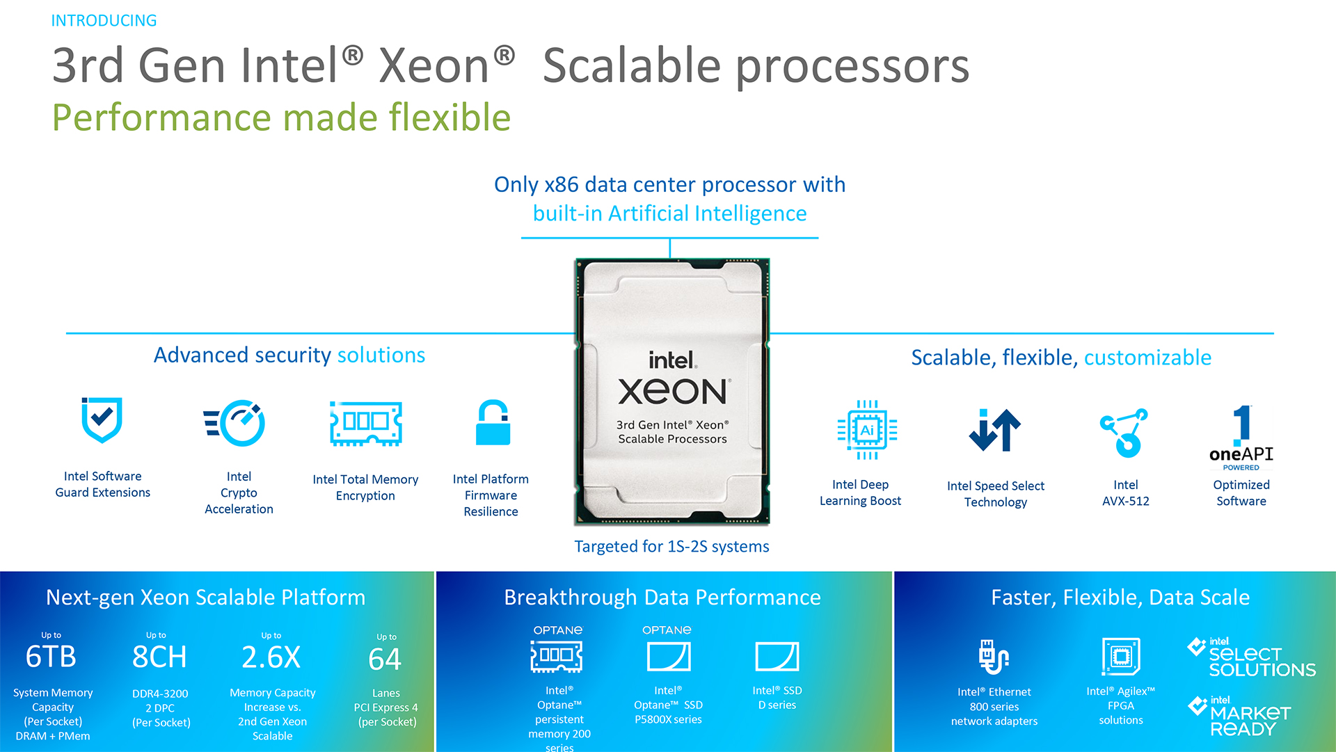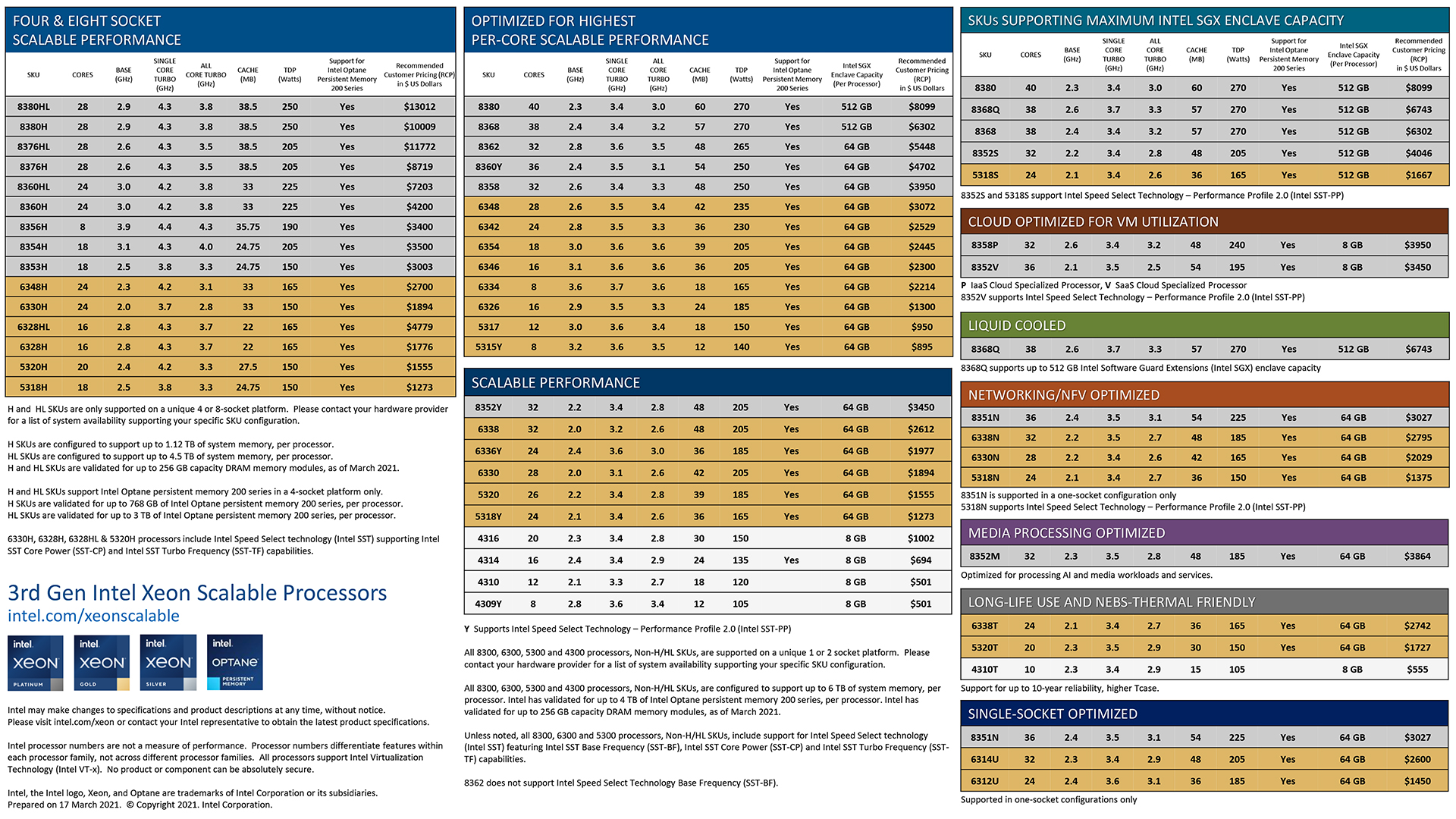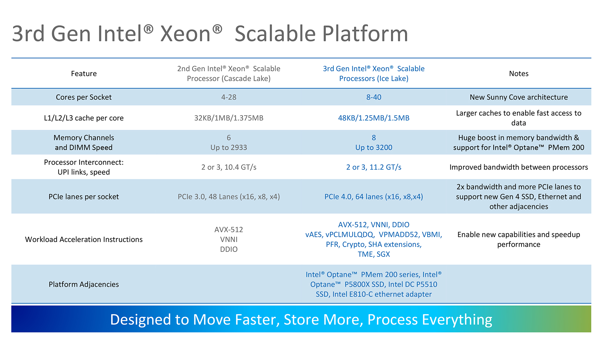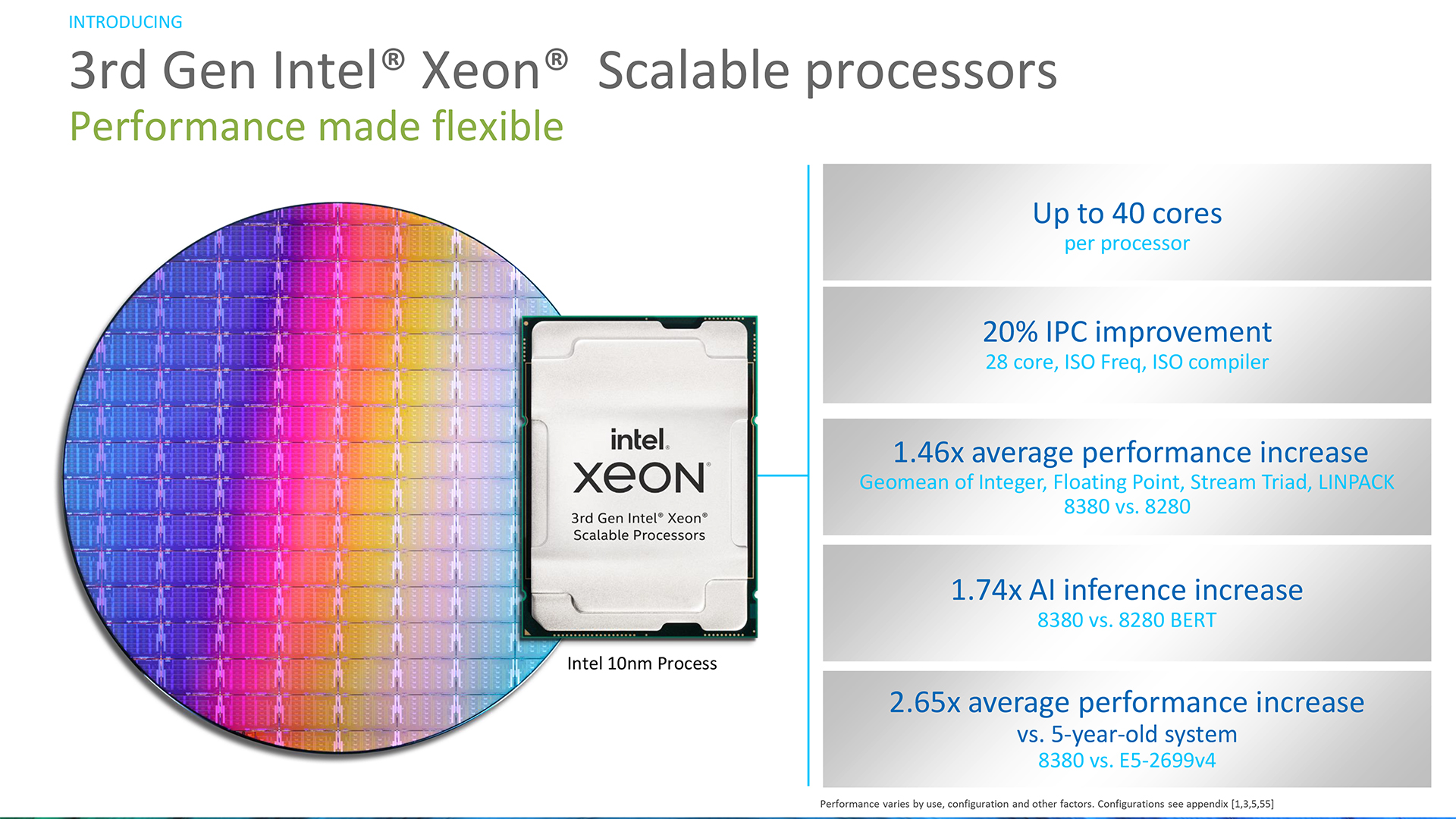 In addition to the raw numbers, the newish Ice Lake cores beat Cascade Lake/Icelake every which way round and this makes Intel's 3rd Gen Scalable Xeon the best Xeon you have ever seen. Intel even goes so far as to claim selective victories over AMD EPYC. The thing is, as we illustrate in our video, the clock speeds of the new 3rd Gen Xeons take a significant step back from the 14nm 2nd Gen parts at the same time that TDP increases.