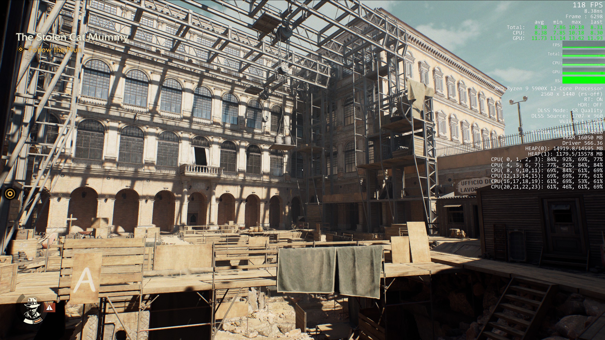 To get a good idea for expected frame rates at different quality levels, I took Indy out to Vatican City and roamed around the Belvedere courtyard, one of the more taxing areas of the game due to the amount of NPC activity. Below you can see my average FPS results with the RTX 4080 at each quality preset with native TAA, QHD resolution and DLSS Frame Gen OFF: