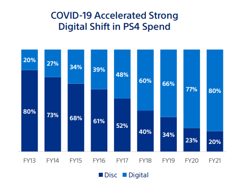 In looking only at the sale of full games, 66% of the sales were digital. This is only a 1 percentage point increase over FY2020, but again, this followed from a much bigger jump between FY2019 and 2020, where digital sales increased from 53% to 65% in just a single 365 day period.