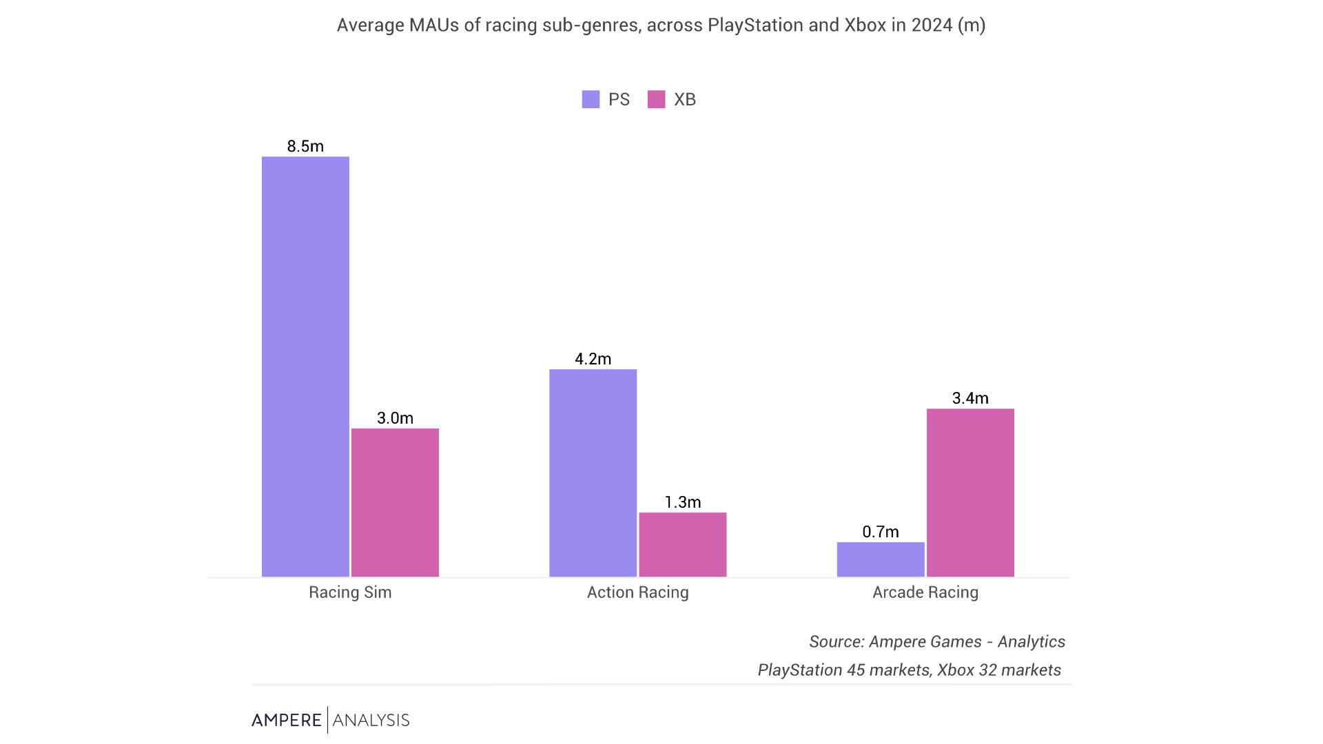 Based on data gathered from 45 PlayStation markets (and 32 Xbox regions), 63% of all racing game players on PlayStation prefer the Sim sub-genre; followed by Action-Racers (31%) and last but also least Arcade Racers at just 5.2%.