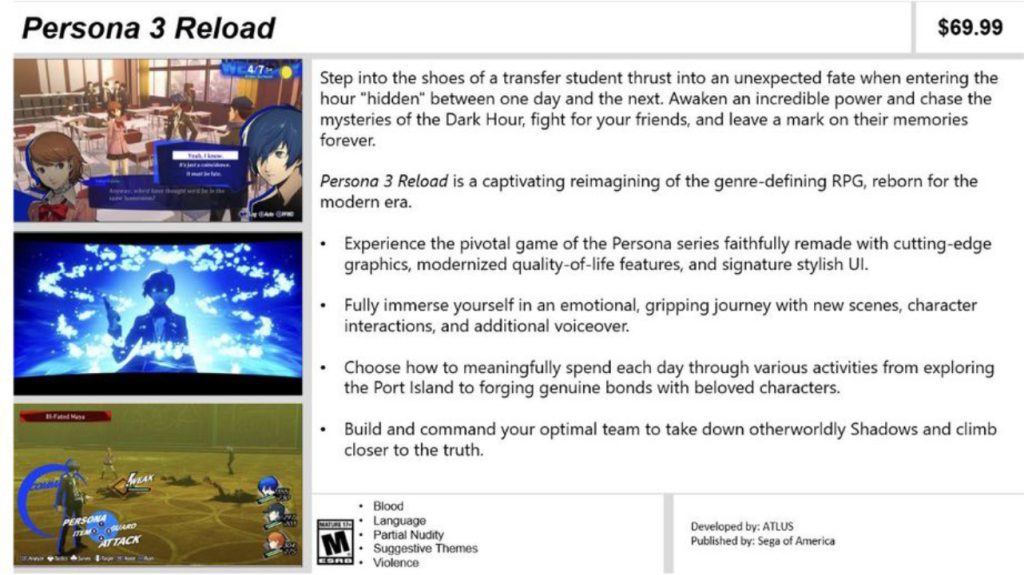 While things can of course change, it seems as though ATLUS is planning on setting the price of Persona 3 Reload at $70. This is thanks to a survey released by SEGA (and shared by ResetEra user ‘Angie’) which asks users to provide feedback on the game’s description for the upcoming Persona 3 Reload. Interestingly, next to the title of the game is what appears to be a price listing for the game, announcing the remake as a $70 title.