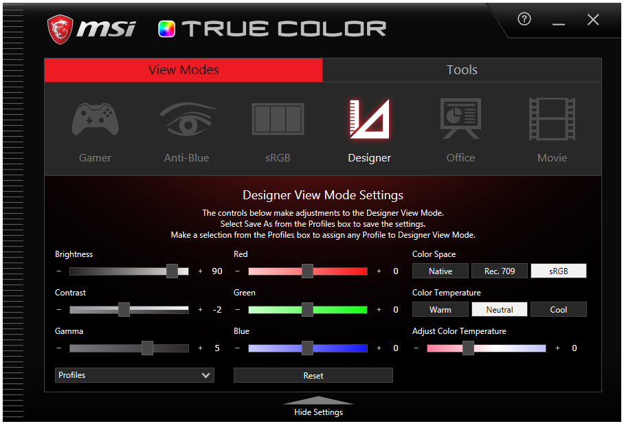 True Color contains two tabs: View Modes, and Tools. View Modes is MSI’s name for the display presets, which as mentioned include the default sRGB, Gamer, Anti_Blue (low blue light), Designer, Office and Movie. However, unlike the selections on many laptops these are all customisable, allowing you to adjust factors as diverse as colour temperature, RGB values, brightness, gamma, and more.