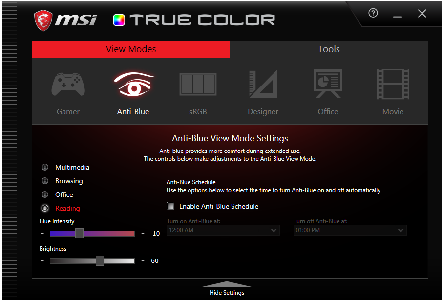 The Gamer ‘view mode’ also lets you save, import and export profiles with any combination of these settings. Anti_Blue, meanwhile, lets you set start and end times in addition to intensity and various sub-presets. MSI has done a really good job of making these presets genuinely useful compared to many other implementations we’ve come across.