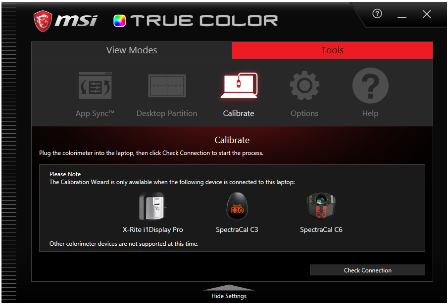 The equally useful Tools tab has several sub-sections, two of which we’ll take a quick look at. First of all, App Sync can set modes or profiles on a per-application basis. The second is called Calibrate, which does exactly what it says on the tin. For calibration, True Color requires that you get your hands on either the Xrite i1 Display Pro or one of SpectraCal’s C3 or C6 colorimeters, as they all share the same basic hardware. If you’re lucky enough to own, beg, borrow or steal (please note, KitGuru does not condone theft) one of these, MSI’s software will calibrate every preset automatically, with no user input whatsoever required.