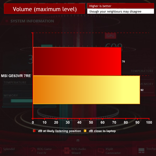 In terms of sheer volume we measured a whopping 92dB maximum near the laptop’s front, which as a point of reference is pretty much as loud as the average motorbike. Depending on your sitting position, your ears will get around 76dB, and this Raider can effortlessly fill a small room with sound.
