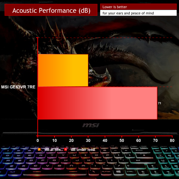 What it’s not, however, is particularly quiet. Now to be fair that’s a challenge we have yet to see any gaming laptop worthy of the name truly meet but, after running Prime 95 and FurMark simultaneously for 15 minutes, idle cooling of around 30dB jumped up to a considerable 71dB, which is louder than the speakers of some laptops.