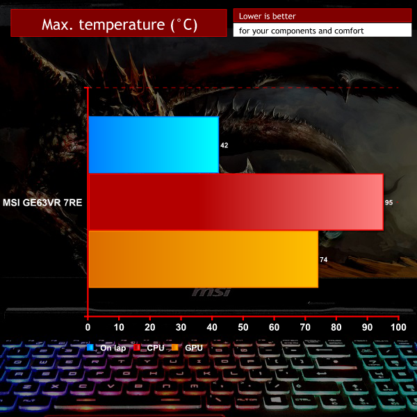In a sensible move for a gaming machine, MSI seems to have focused most of the power of its Cooler Boost 5 solution on the GPU, which never reached higher than 74°C. Interestingly, activating the aforementioned maximum cooling switch (or the maximum noise switch, as we prefer to call it) took those temps down to 94°C /70°C, with the fans for both running between 4200-4800rpm.