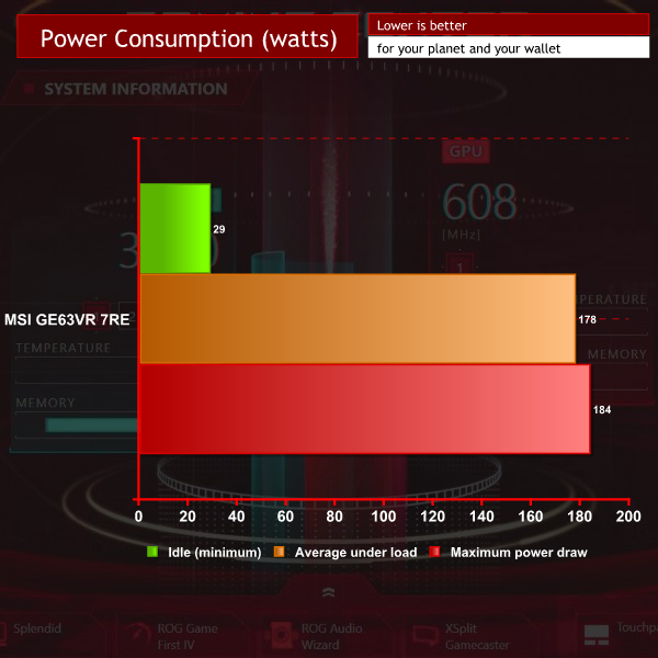At idle, the GE63VR 7RE draws an average of between 29-65W. Average under load was around 178W, while the highest we measured from the wall was 184W. This is with the screen at maximum brightness and GPU/CPU under full load.