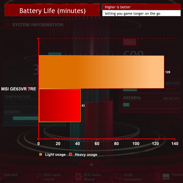 With screen brightness set to 120cd/m2 the battery only lasted 129 minutes in the Reader test, which reflects light usage. Running an intensive test to simulate gaming with the screen at maximum brightness, the GE63VR 7RE managed just 43 minutes, so this may not be the best machine if you’re looking for something that will last you for long train or plane journeys without a power outlet.