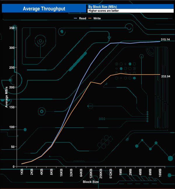 Kingston quote a maximum read speed for the drive of 250MB/s. In our throughput test, we managed to get a bit more out of the drive at 315.14MB/s (16MB block). Writes peaked at 234.42MB/s (1MB block) before dropping back slightly to finish the test run at 232.04MB/s. Both of these write results are a good deal quicker than the official 180MB/s rating.