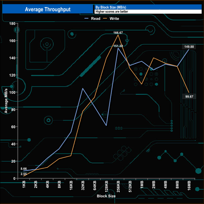 The throughput test results from the drive are pretty erratic, to say the least. Both reads and writes peaked at the 256KB block mark, with write results of 166.67MB/s and read results of 151.22MB/s. The drive finishes the test run (16MB block) with a read result of 149.88MB/s with writes down at 99.67MB/s.